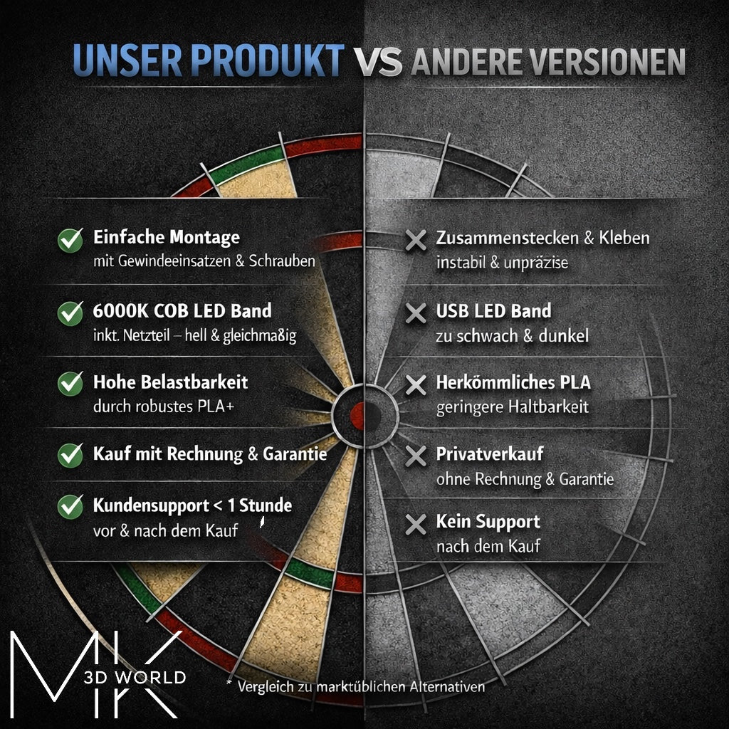 Durch die stabile, verschraubte Konstruktion, vormontierte Gewindeeinsätze und eine durchdachte Bauweise gelingt der Aufbau schnell, präzise und sauber – ideal für ein langlebiges Setup an deinem Dartboard.